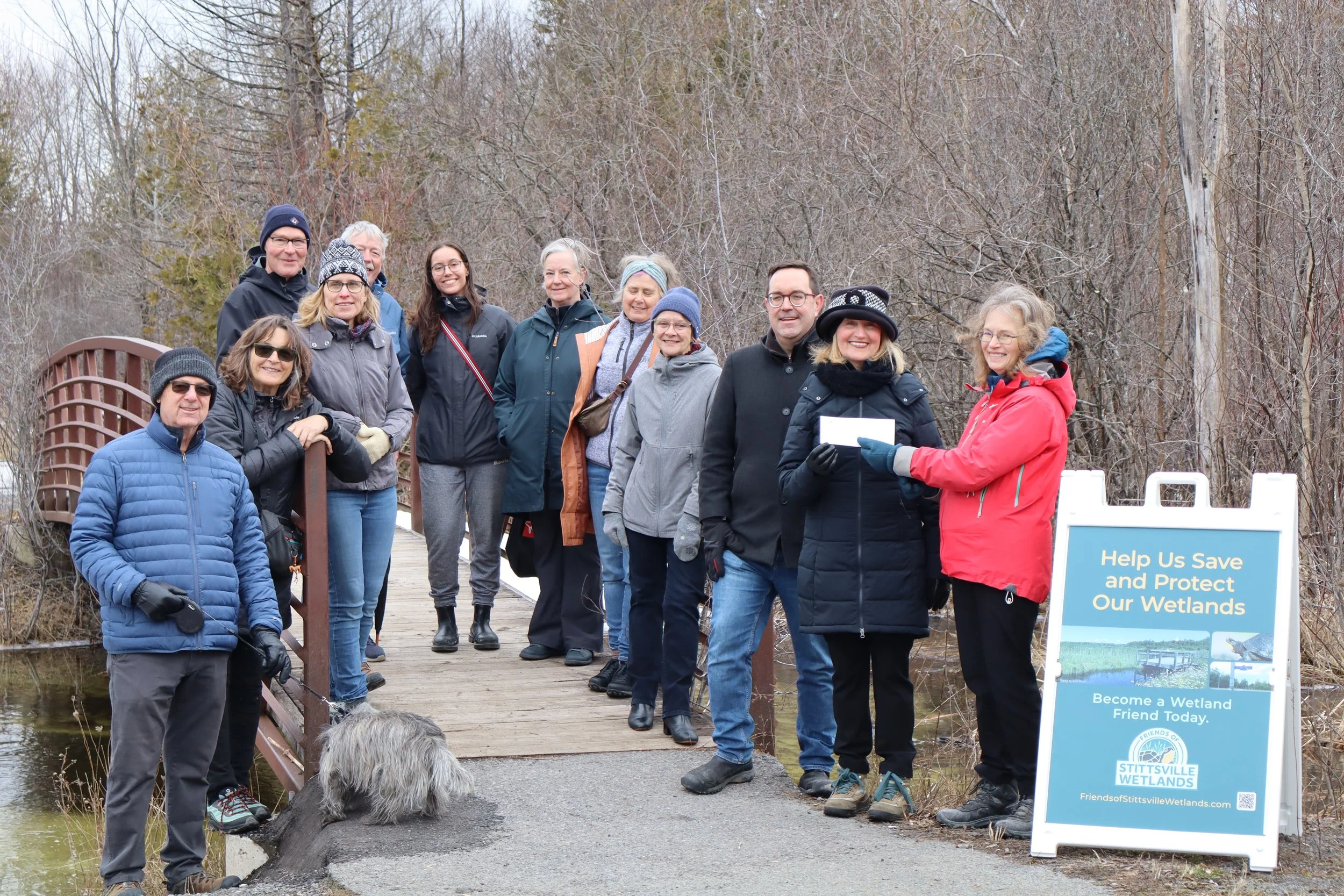 Left to right: Volunteers of Friends of Stittsville Wetlands including Maurice Albert and Chia, Lynda Cronin, Susan Waters, Rudy Stavinga, Treasurer, Bruce Dudley, Vice President, Grace Dhaliwal, Cally Abraham, Laura Dierker, Terry Swaine, Past Treasurer, Stittsville Councillor Glen Gower, Janet Stavinga, President, and Janet Mason, Chair of the Ottawa Stewardship Council.